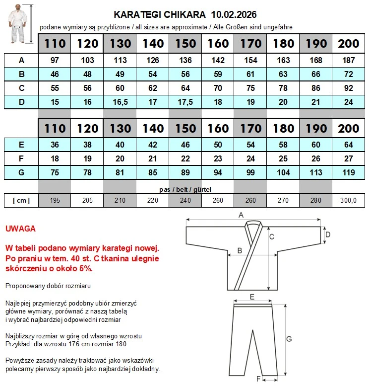 Przed zakupem proponujemy dokładnie się pomierzyć i zapoznać z wymiarami z tabeli i pamiętać o tym że karatega kurczy się w praniu.
